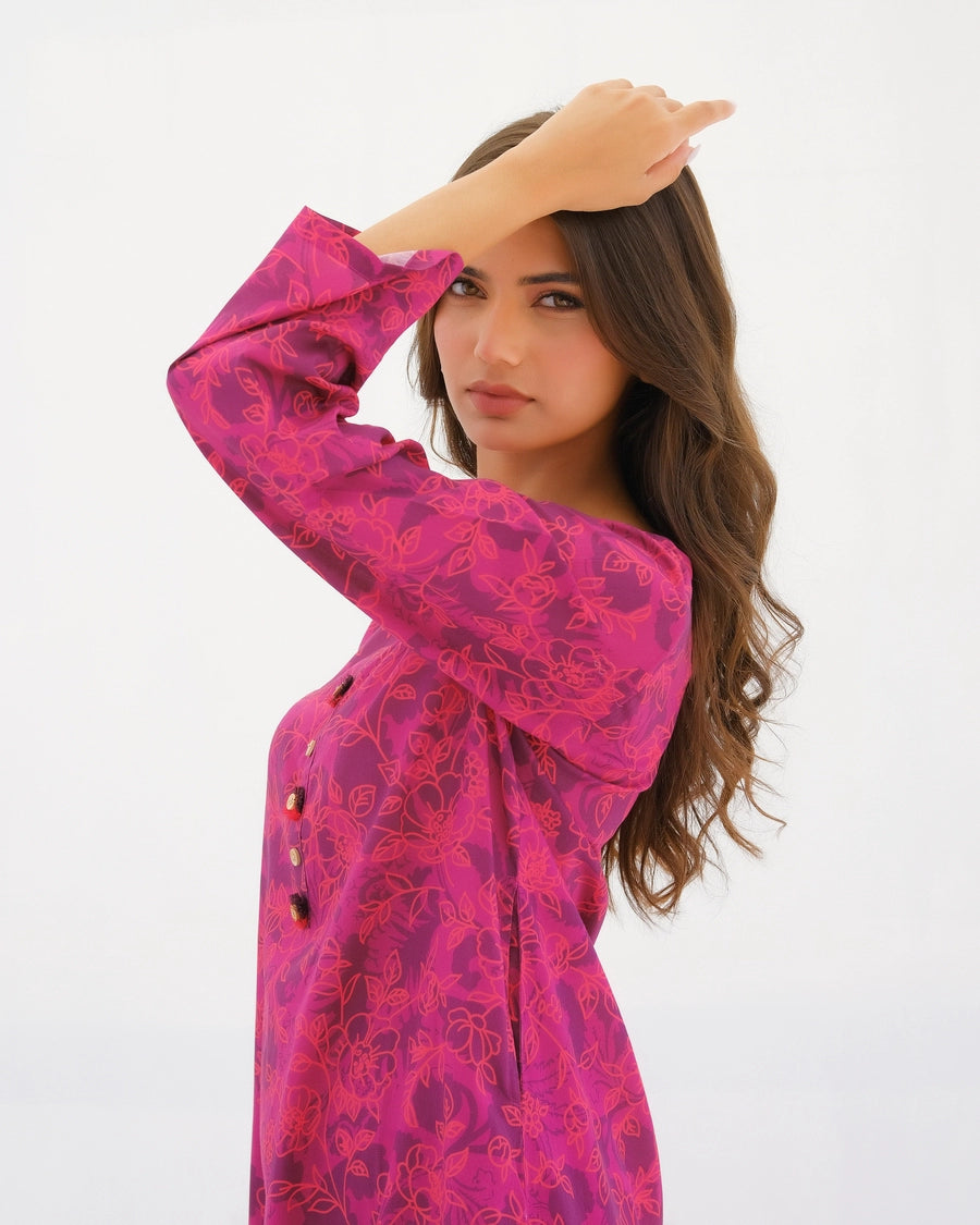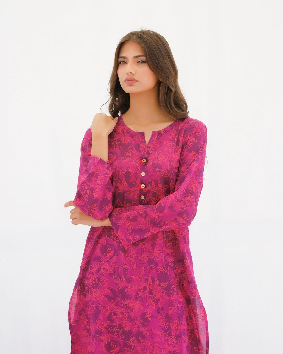 Step up your wardrobe with our exquisite printed Matching separates. This stunning 2-pc enhances intricate button detailing on the neckline of the shirt with convenient side pockets, and perfectly paired trousers.