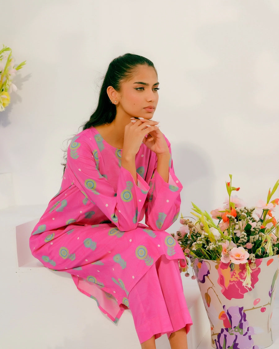 Step up your wardrobe with our exquisite printed Matching separates. This stunning 2-pc enhances intricate button detailing on the neckline of the shirt with convenient side pockets, and perfectly paired trousers.