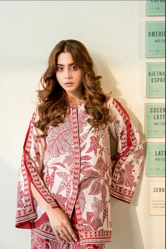 Design: Red And Off-white Floral Line Art Fusion Printed.