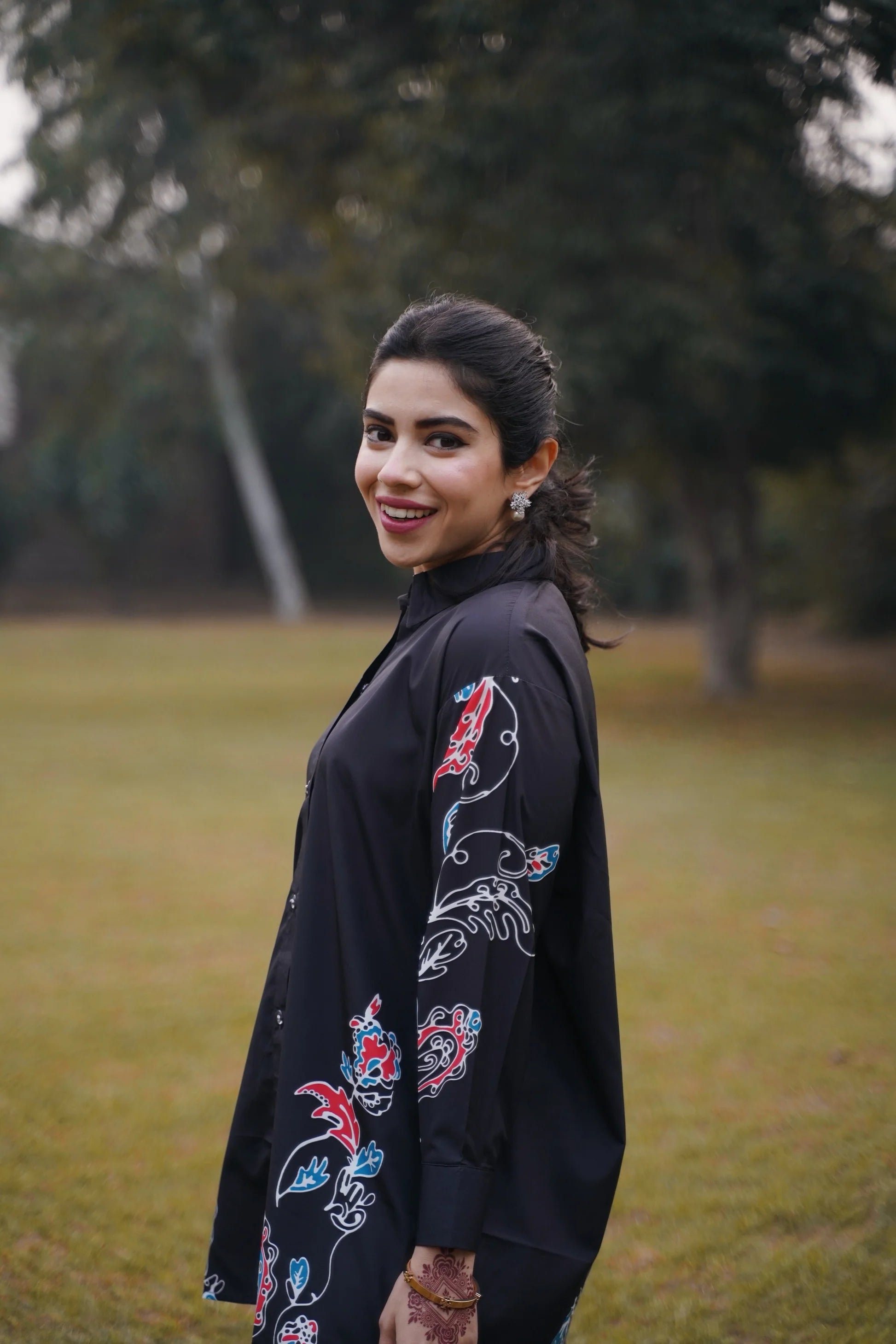 The radiant ensemble offers a unique and stylish look for any special occasion. This 2-piece suit features a chic contemporary short shirt with minimal floral prints. The matching trousers make it a trendy outfit to style at fun gatherings.